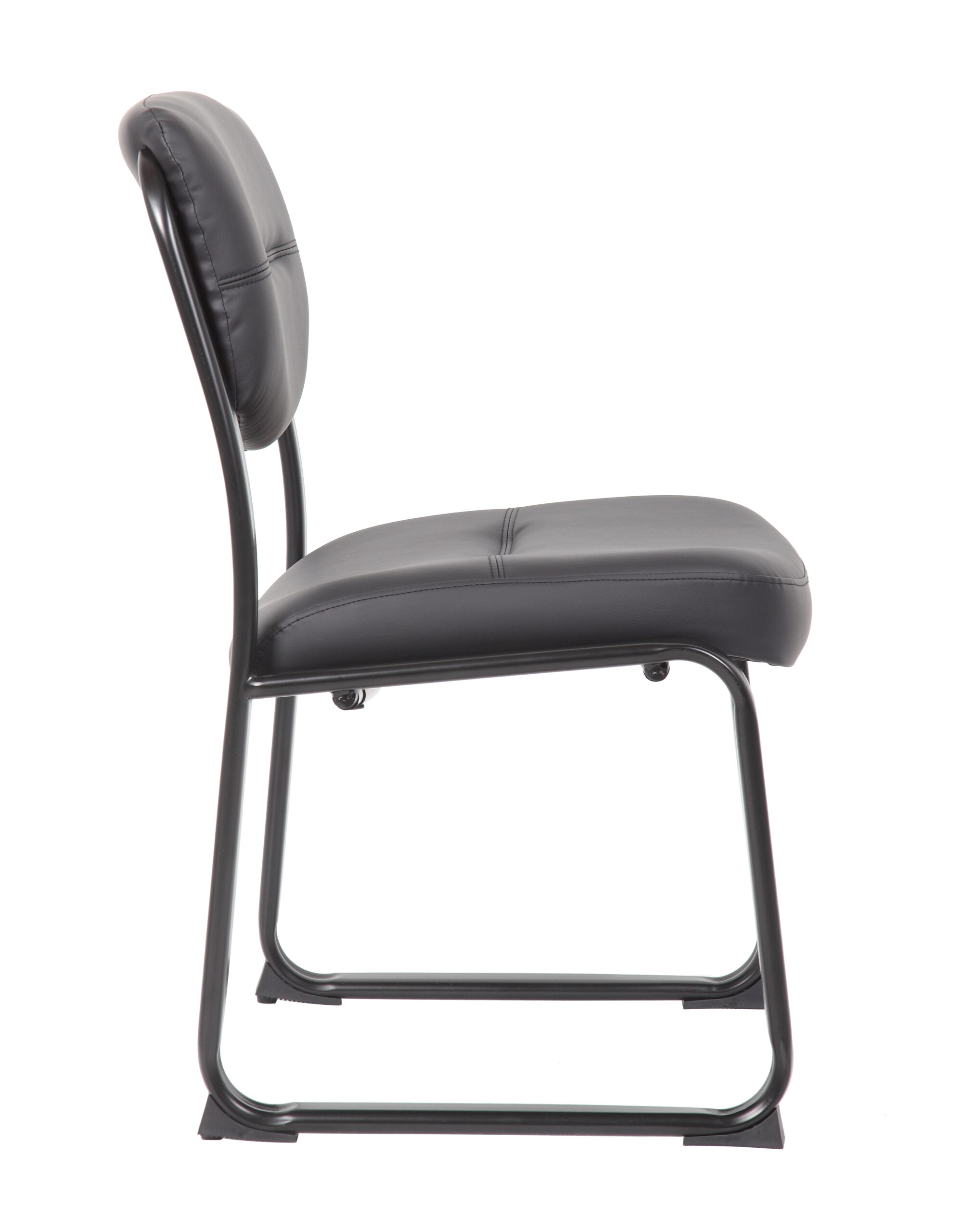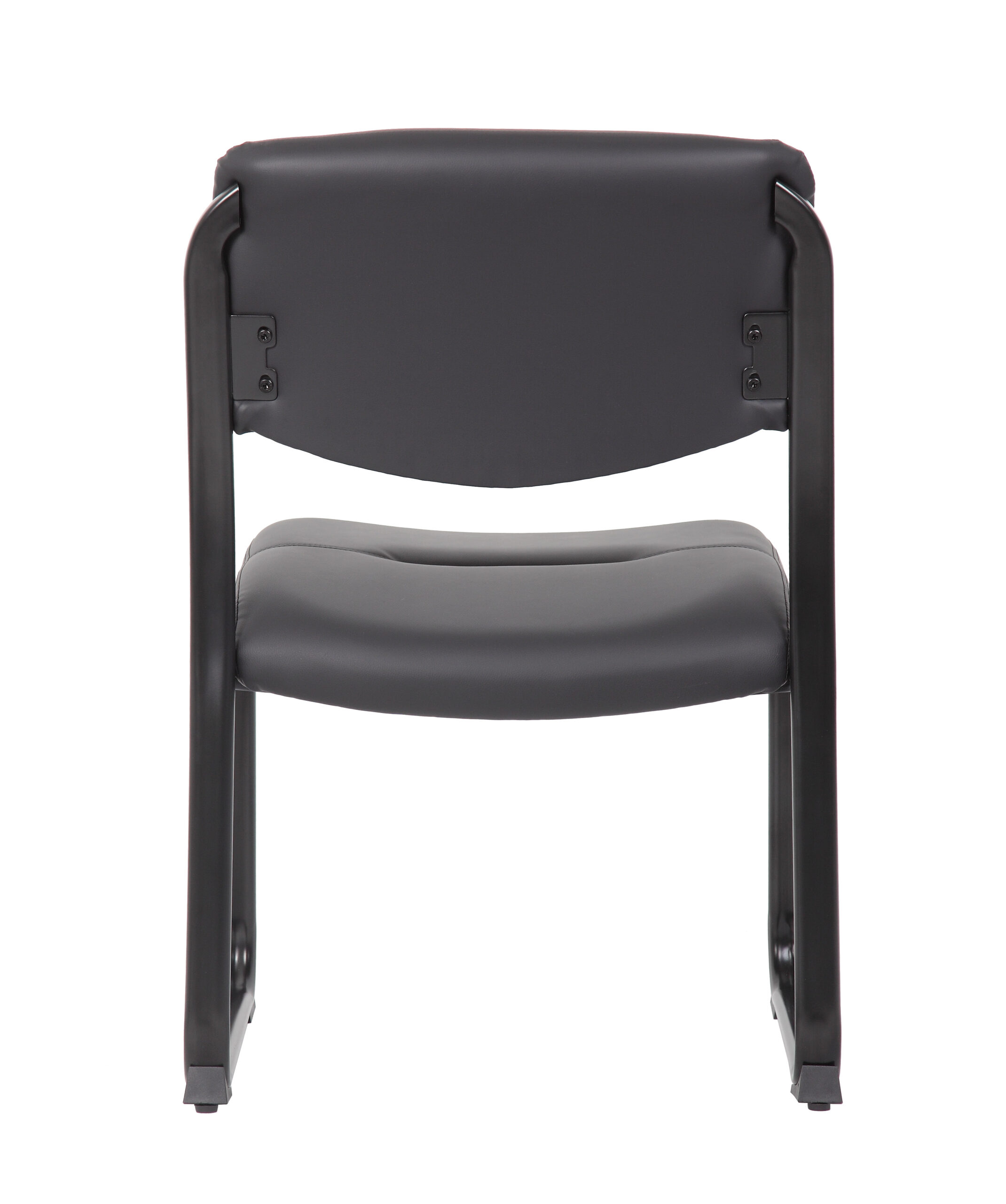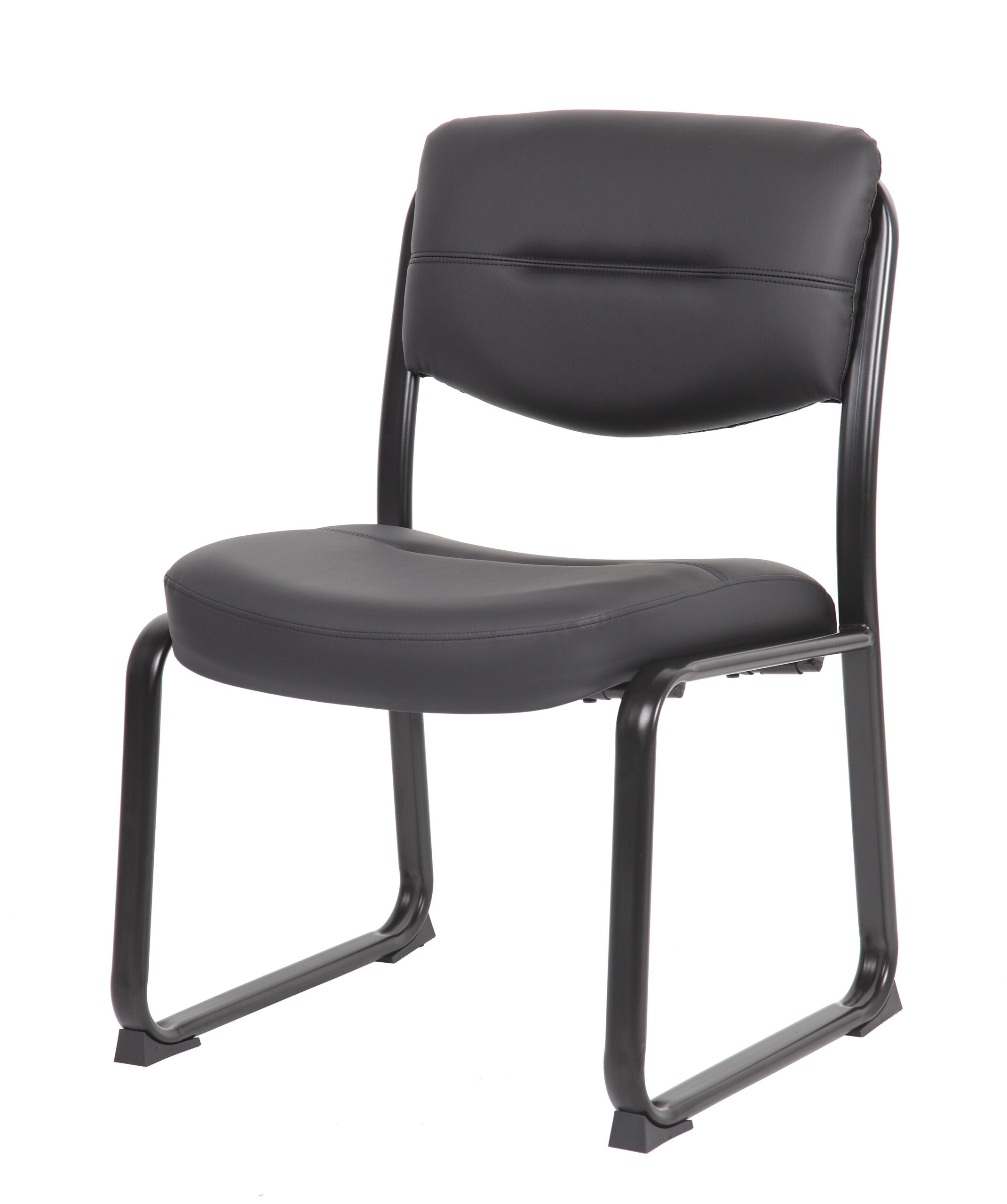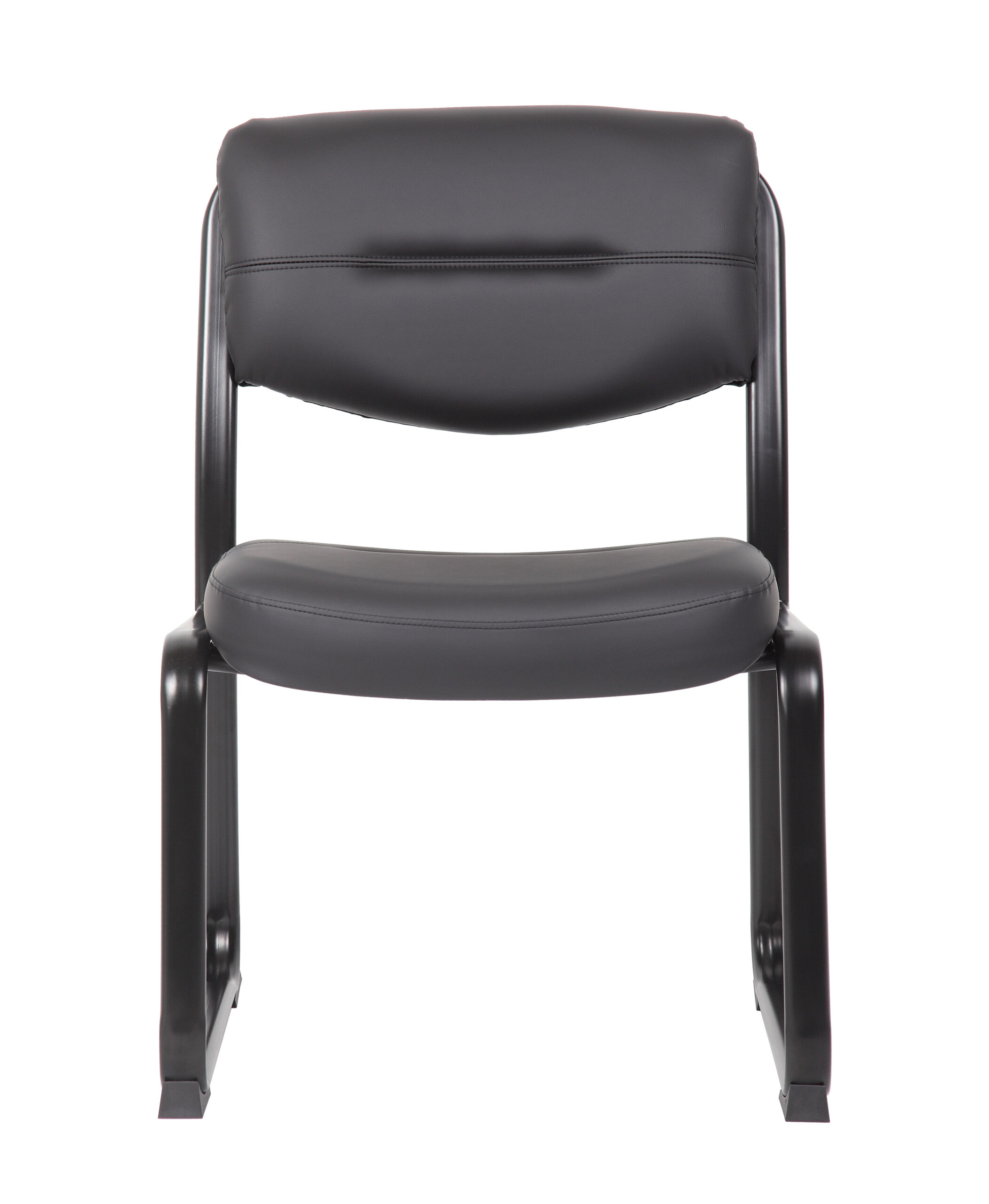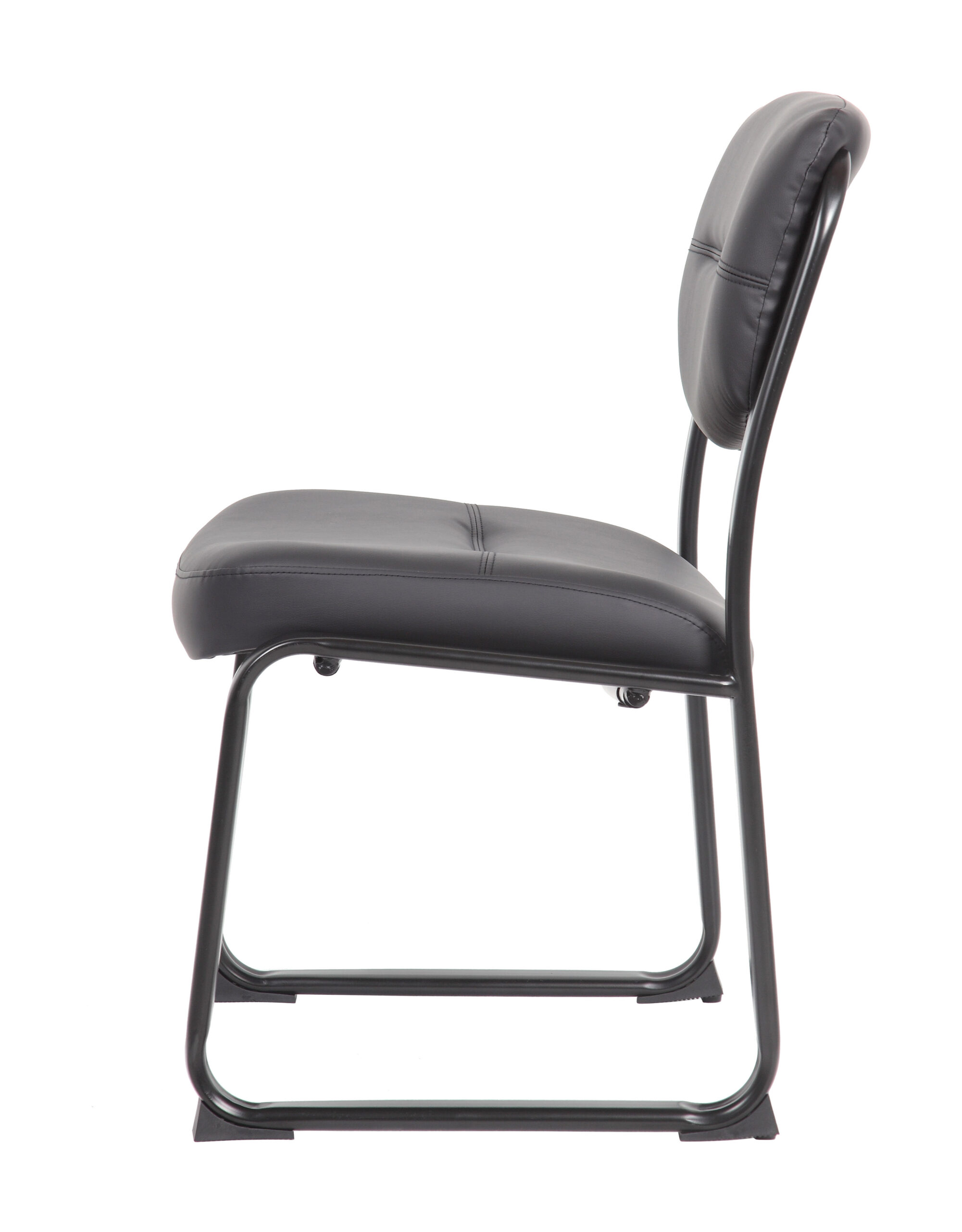 This guest chair is beautifully upholstered with LeatherPlus, a combination of leather and polyurethane thats comfortable and durable in equal measure. Ready to spruce up just about any kind of room, it features a polished tubular steel frame with black powder coated finish, a contoured seat for firm lumbar support, and thick contoured cushions for added comfort and support. Its sleek black color ensures it looks great in a variety of color schemes.